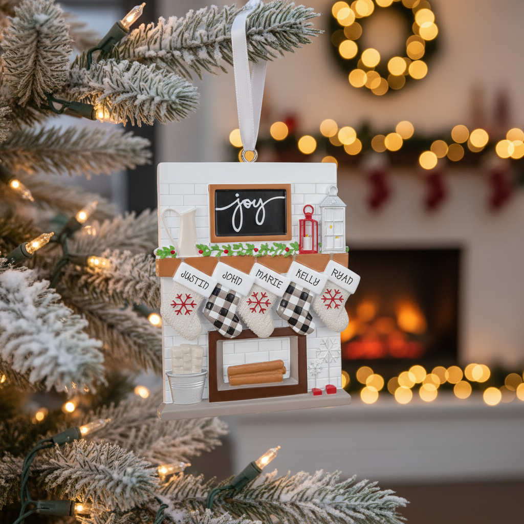 Fireplace Mantle Family of 4 Personalized Christmas Ornament